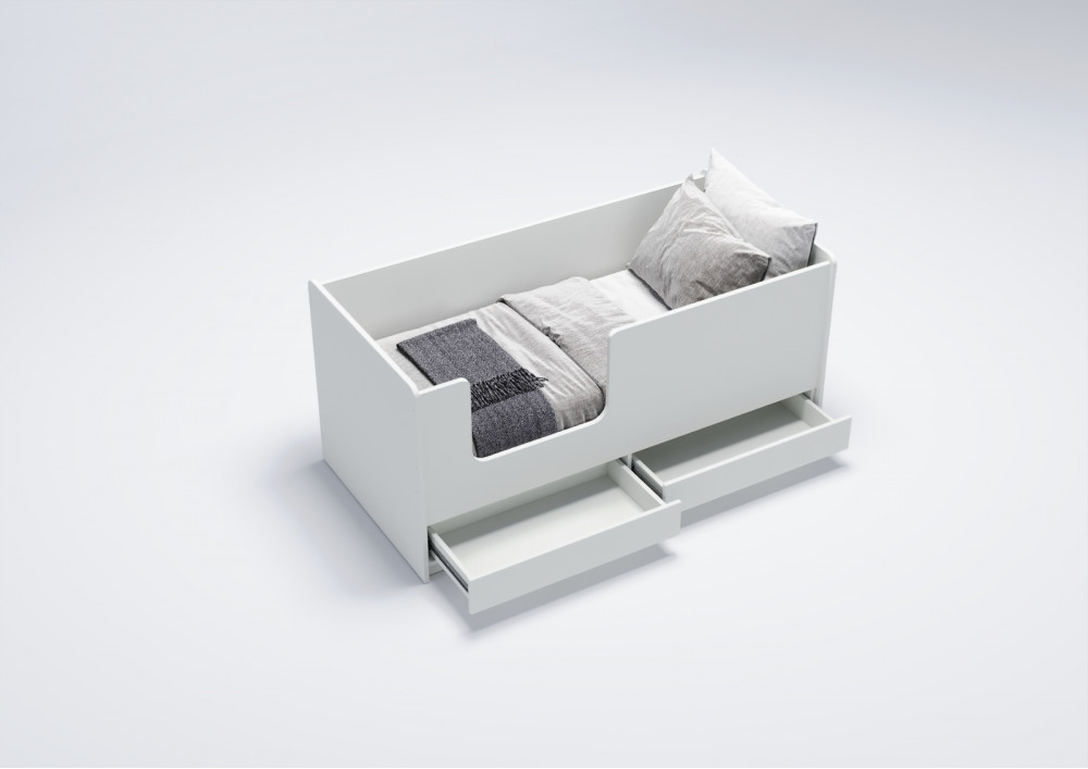 Уникальной особенностью модели "Легенда K202.04" являются два выдвижных вместительных ящика. Они оборудованы телескопическими направляющими с фиксаторами, что обеспечивает плавное выдвижение и фиксацию ящиков. Это позволяет эффективно использовать пространство под кроватью для хранения игрушек, одежды и других детских принадлежностей.